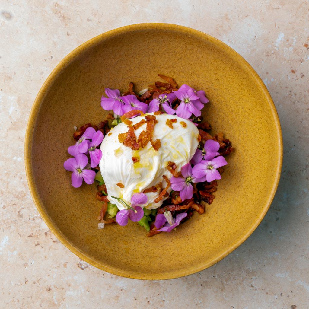• Egg soufflé with spinach, crushed peas and dame's violet