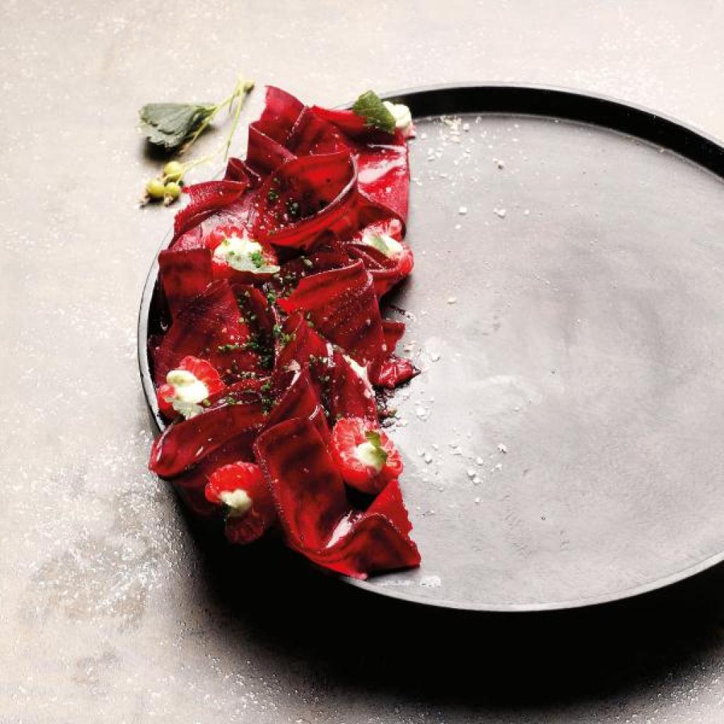 Punajuuricarpaccio mustaherukanlehtimajoneesilla on tyylikäs ja ylellinen vähäkalorinen annos, joka pursuaa makua. Se yhdistää maapohjaisen punajuuren ja mustaherukanlehtien raikkauden villivadelmien säestämänä – luoden visuaalisesti upean ja herkullisen kokemuksen.