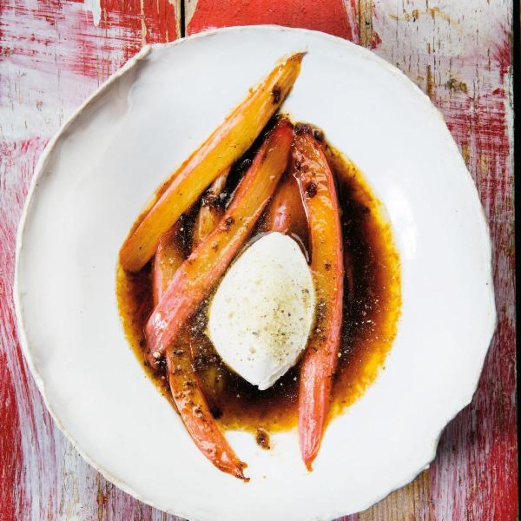 Leikkaa raparperinvarret viistoon paloiksi. Ruskista voi pannulla yhdessä pihlajansilmu-sokerin kanssa. Lisää raparperipalat ja paista muutama minuutti, välillä sekoittaen. Lisää neste ja anna kiehua. Hauduta, kunnes seos sakenee ja raparperi pehmenee, noin 5 minuuttia. Sammuta liesi ja anna makujen imeytyä noin 10 minuuttia.